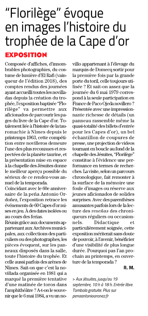 Pour la 63° fois de son histoire la Peña Ordóñez met en compétition son trophée chargé d’histoire « la Cape d’or ». Tous les triomphateurs d’avant-hier, d’hier, ou les toreros vainqueurs plus contemporains soulignent la place qu’elle a occupé ou qu’elle occupe dans leur parcours.