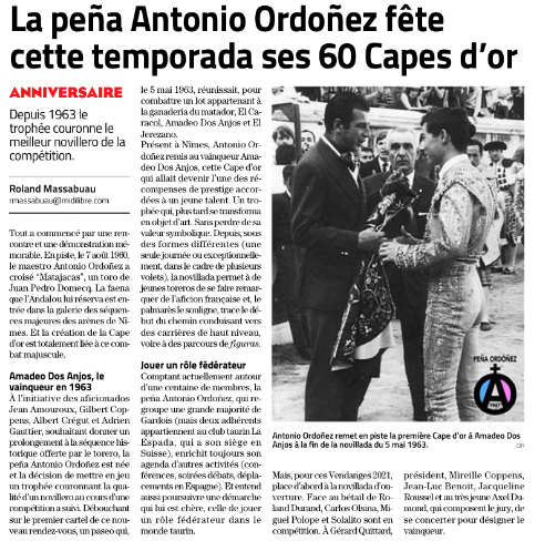 Notre assemblée générale n'ayant pas pu avoir lieu en présentiel en début d'année, c'est avec beaucoup de joie et d'allegria que les membres de Peña Antonio Ordóñez se sont retrouvés le 16 septembre 2021, au soir de la soixantième Cape d'Or pour fêter le soixantième anniversaire d'existence de la peña.
