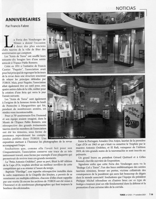 Dans son numéro 2153, la revue TOROS évoque l'exposition consacrée aux soixante Capes d'Or. La reseña de la novillada est par ailleurs téléchargeable en page PALMARÈS. Bonne lecture (cliquez sur l'image pour l'agrandir)